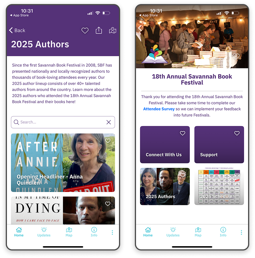 SBF staff will send push notifications to help you optimize your Free Festival Saturday experience. The app also offers an interactive schedule of events, author bios, book descriptions, easy-to-access directions between venues, and everything else SBF.