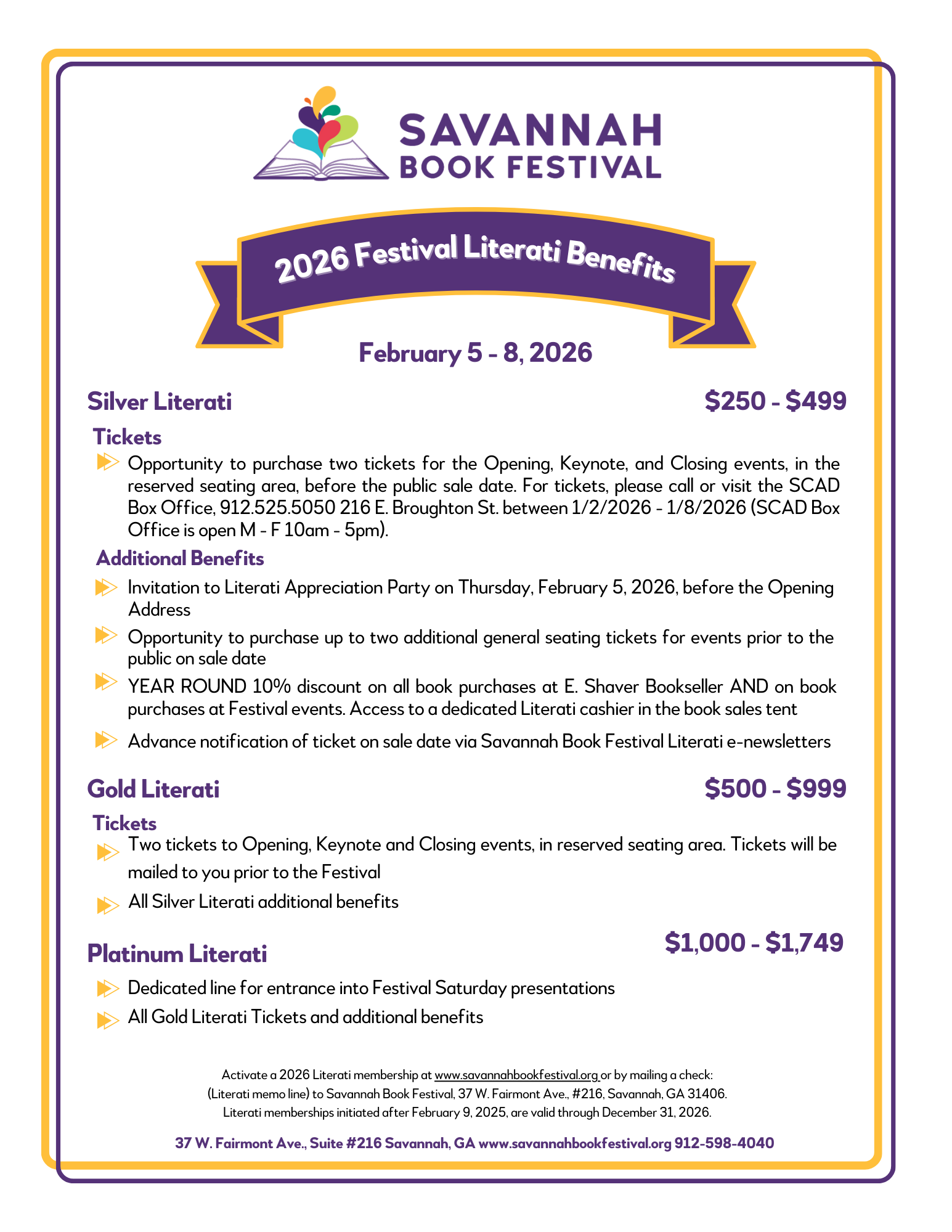 Savannah Book Festival, 37 W Fairmont Avenue #216, Savannah, GA 31406 (Please note LITERATI in the memo line)